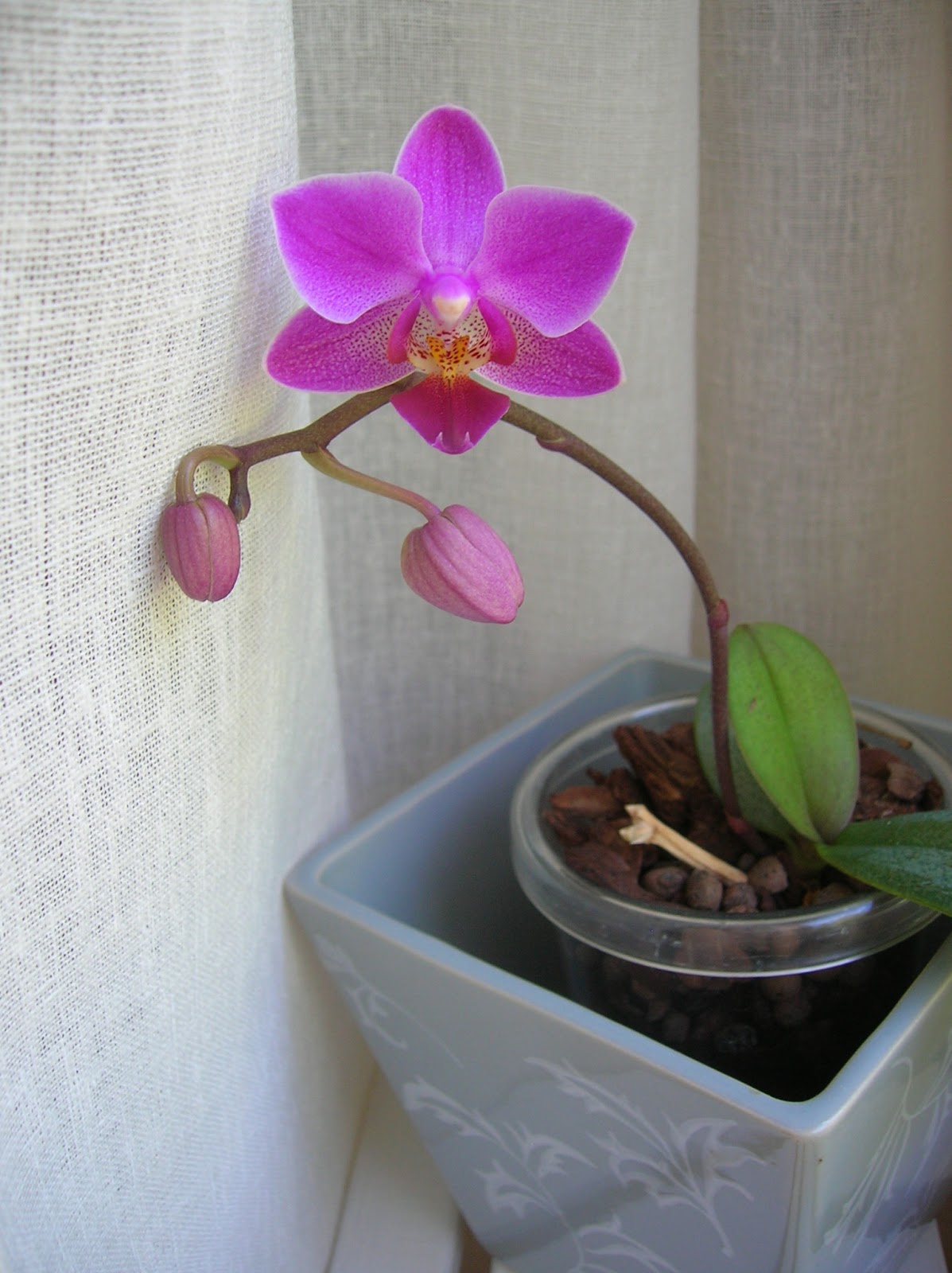 Ilokseni huomasin, että talvella pistokkaana saamani orkidea oli avannut ensimmäisen kukkansa. Olin aina kuvitellut orkidean kavattamisen jotakuinkin haasteelliseksi, mutta säännöllinen, joka lauantainen uppokastelu on tuottanut tulosta.